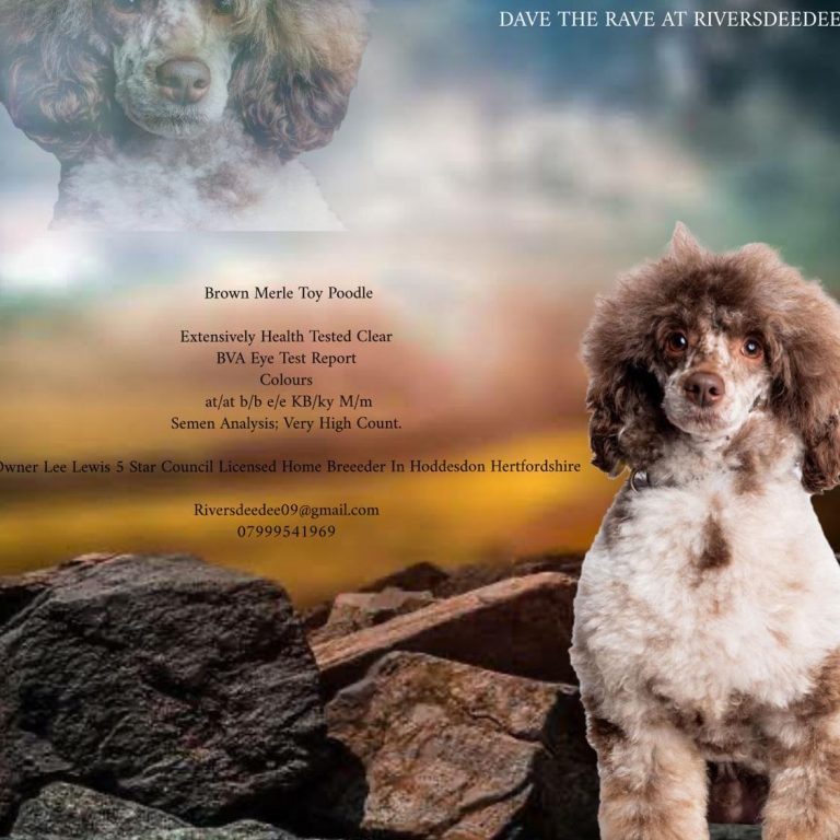 Our extensively health-tested Toy Poodle is available for stud duties only. He is a beautifully marked brown merle, with excellent structure He has a outstanding temperament, A true gentleman with the girls — calm, gentle, friendly, and confident. He has a lovely playful nature and is excellent with other dogs, and a proven track record as a reliable, successful stud,