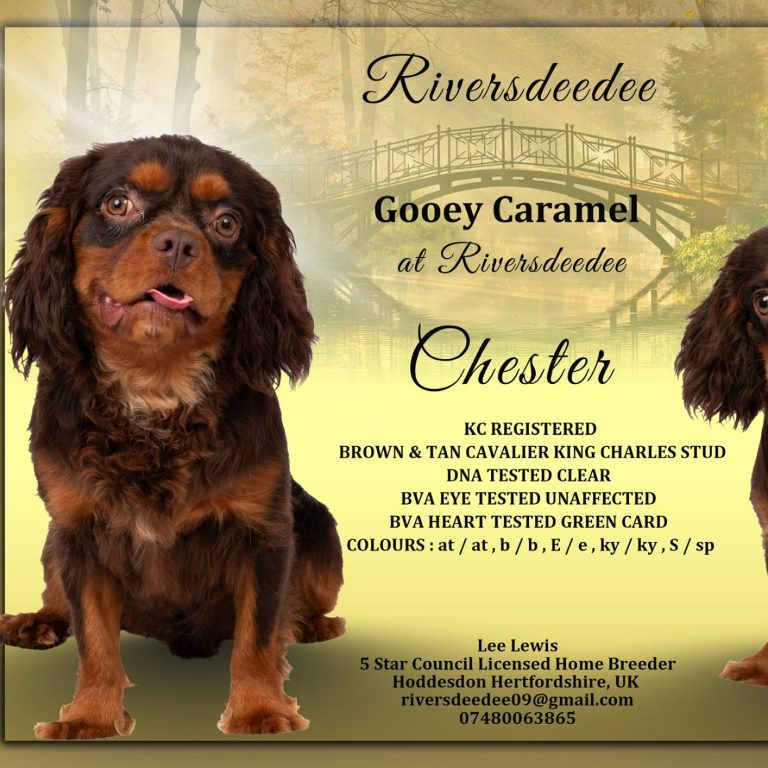 Our extensively health-tested Kennel Club Registered Brown & Tan Cavalier is available for stud duties only. He is a beautiful Rich Brown with Gorgeous Tsh points. He has amazing hazel / green eyes. He has excellent structure He has a outstanding temperament, A true gentleman with the girls — calm, gentle, friendly, and confident. He has a lovely playful nature and is excellent with other dogs, and a proven track record as a reliable, successful stud,